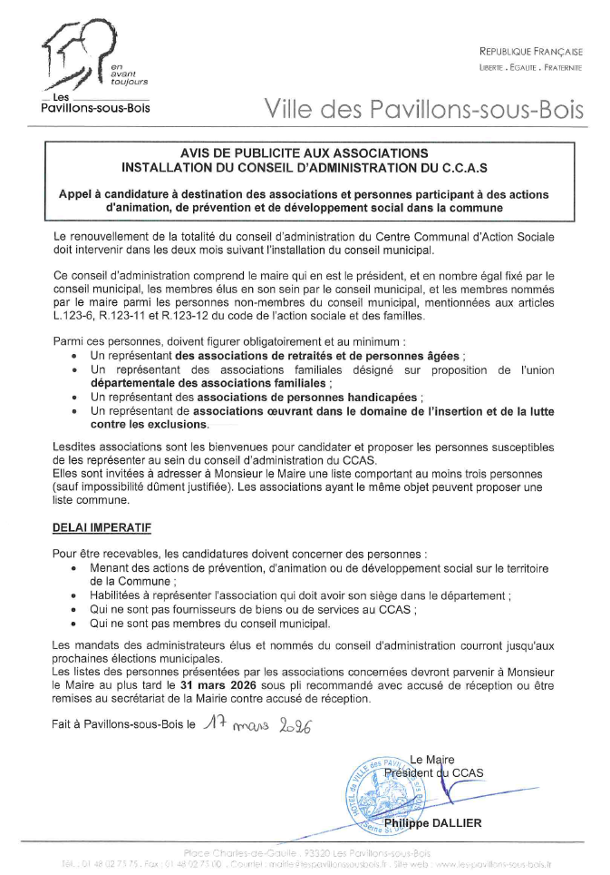 Avis de publicité aux associations Installation du Conseil d’administration du CCAS Installation du xonseil d'administration du CCAS Consulter Taille : 203.13 Ko Extension du fichier : pdf Publié le 17 Mar. 2026 Zoom on image Avis de publicité aux associations installation du conseil d'administration du CCAS Retour à la liste Retour à la liste