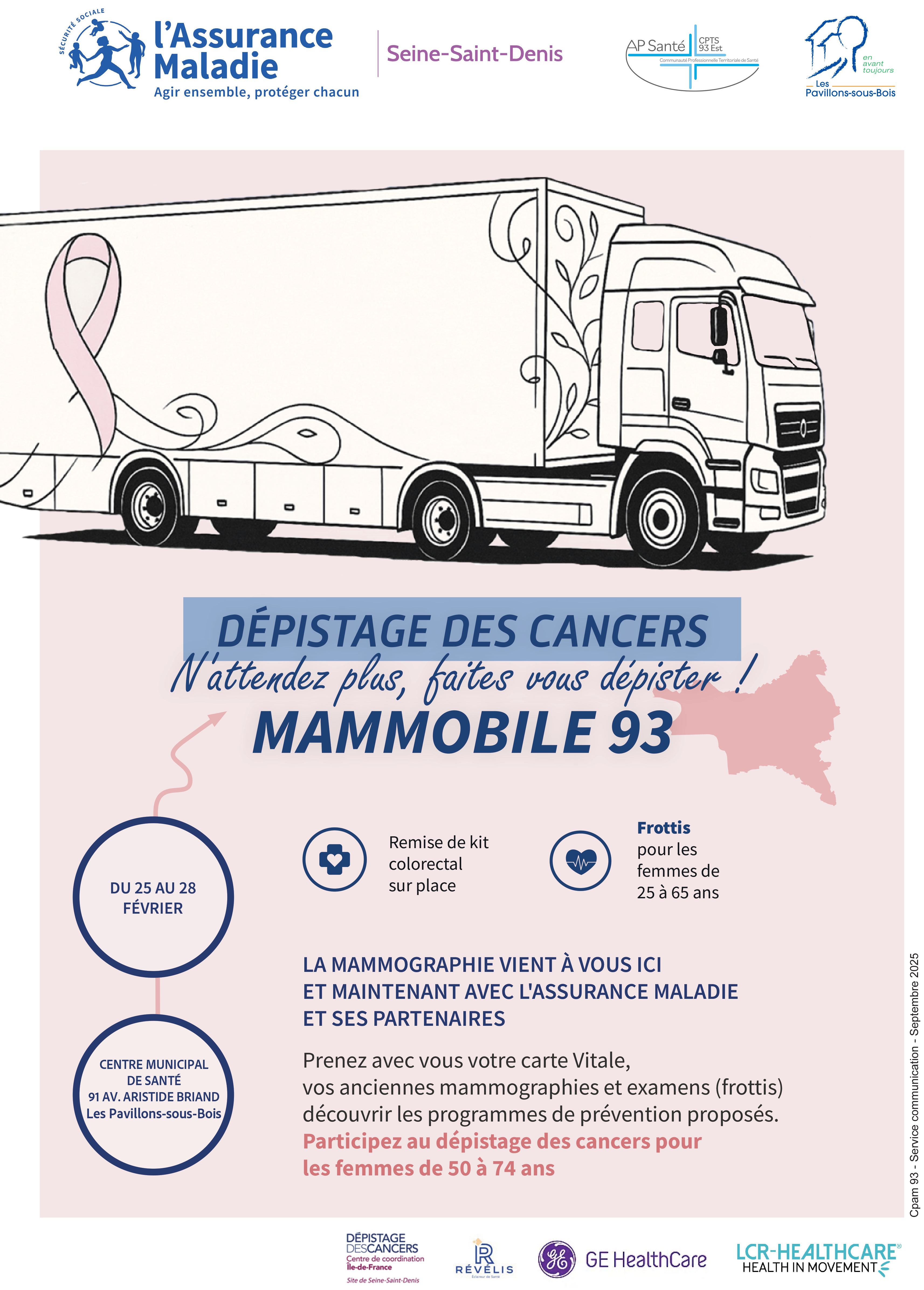 Cette opération organisée par la CPAM de Seine-Saint-Denis en partenariat avec la CPTS de Livry-Gargan et la ville des Pavillons-sous-Bois à pour objectif de proposer gratuitement aux femmes un accès direct et simplifié au dépistage du cancer du sein et du col de l’utérus, dans un territoire où les demandes de rendez-vous peuvent être longues.